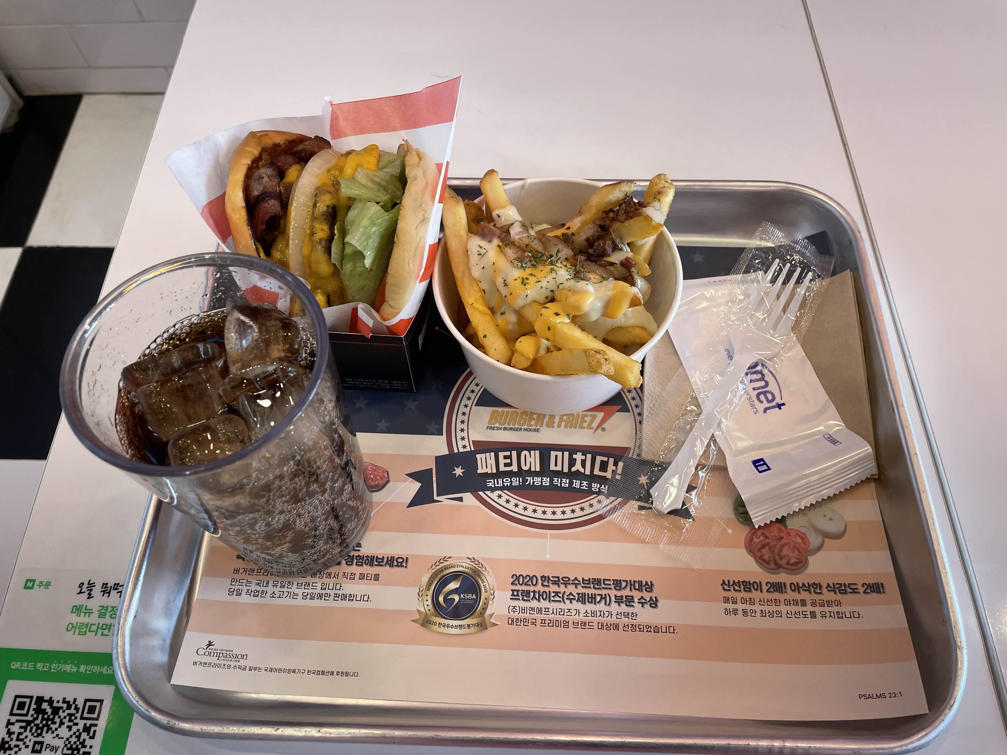 제가 치즈가 많이 들어간 감자튀김과 햄버거를 먹어보니 짭짤한 맛과 양배추의 아삭한 맛이 맛있습니다.