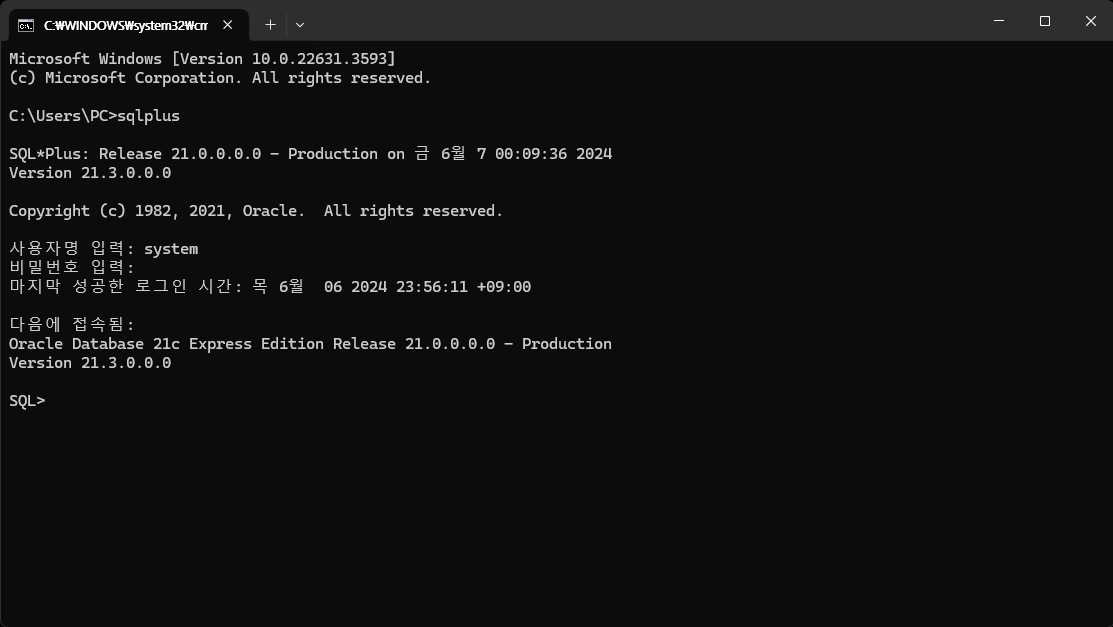 sqlplus 입력한 후 엔터 -> system 엔터 -> 설치 시 등록했던 비밀번호