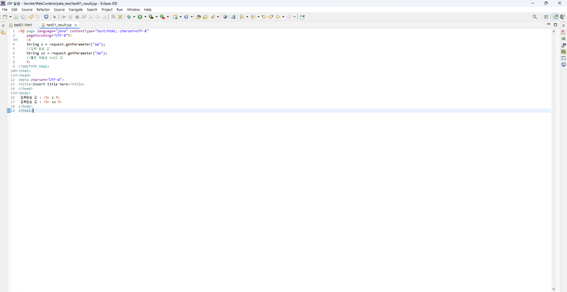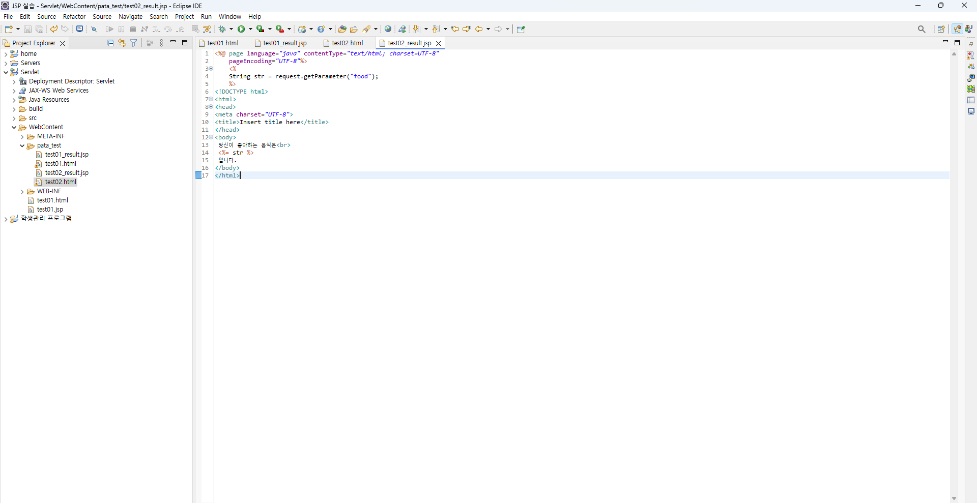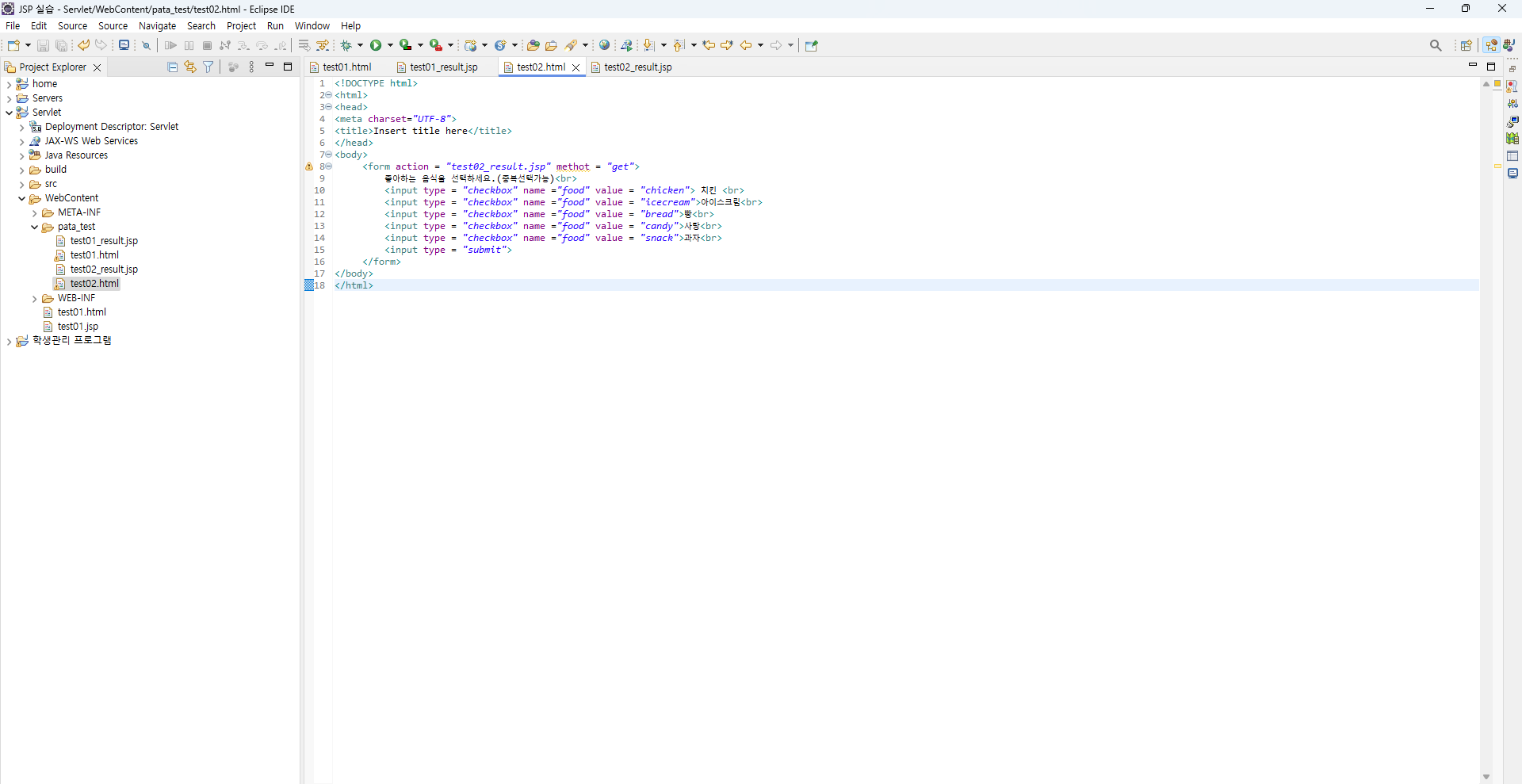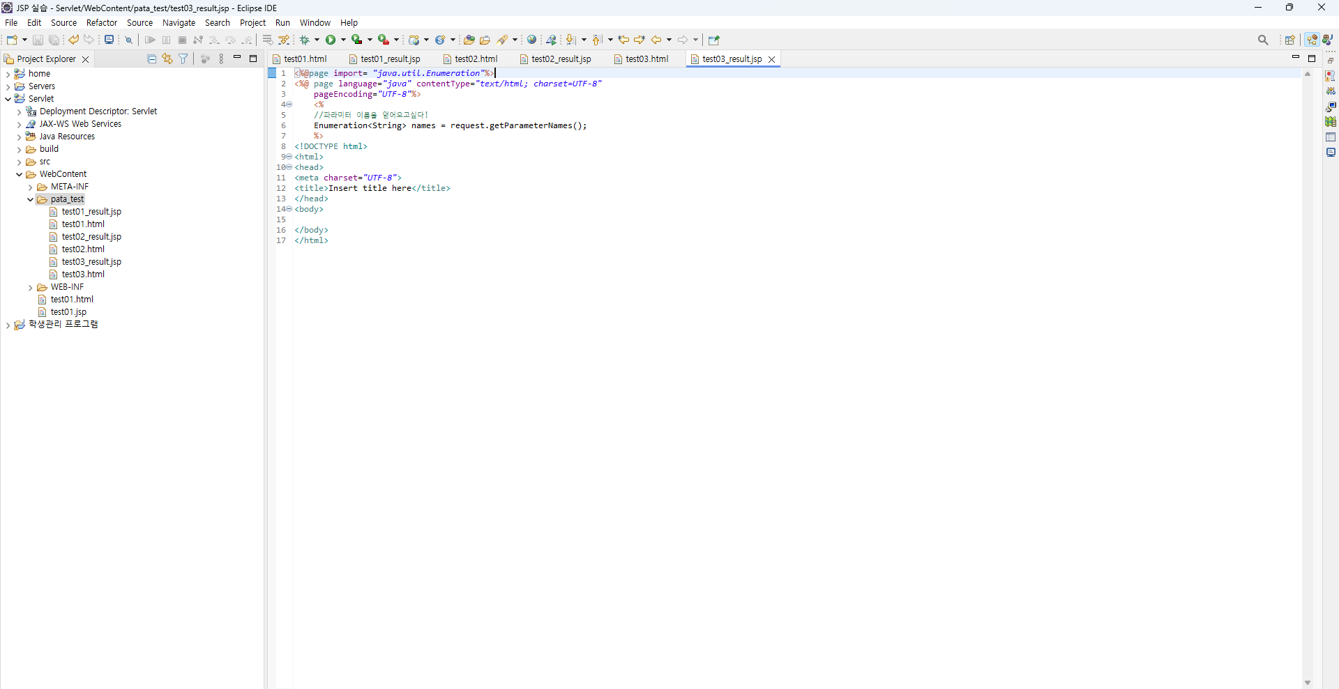 html생성시 만든이름 test01과 <form action = "test01_result.jsp" method = "get"> 명령어 내용의 action의 앞부분test01을 맞춰서 입력 해줍니다.