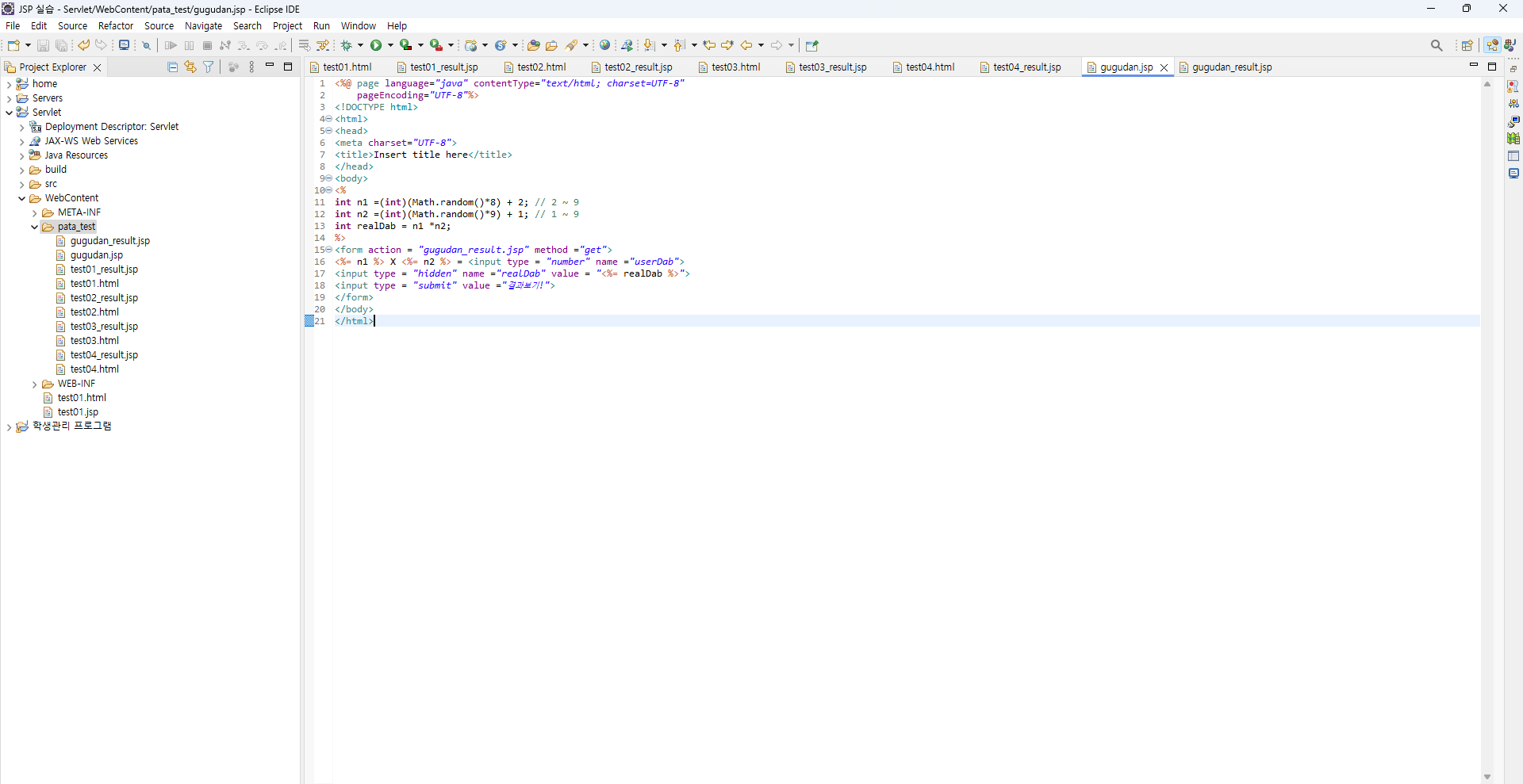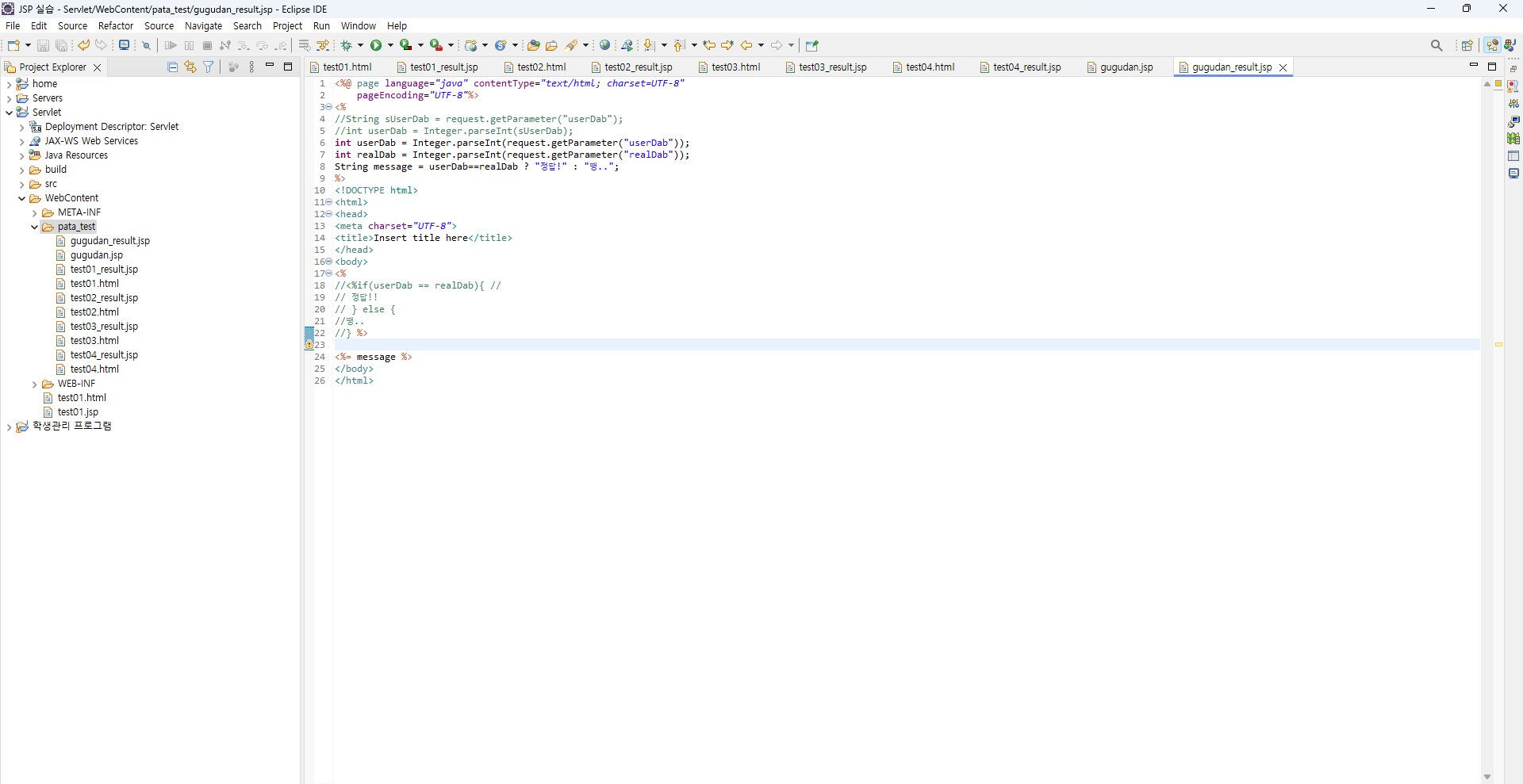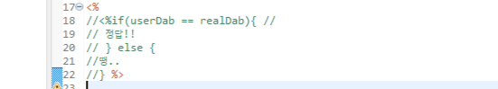 이 부분은 String message = userDab==realDab ? "정답!" : "땡.." , <%= message %> 해당 코드들이 값을 나타내기 위에 쓰인 것처럼 기호 ?로 표기를 못했을 때 자바의 if문을 사용한 것이다.