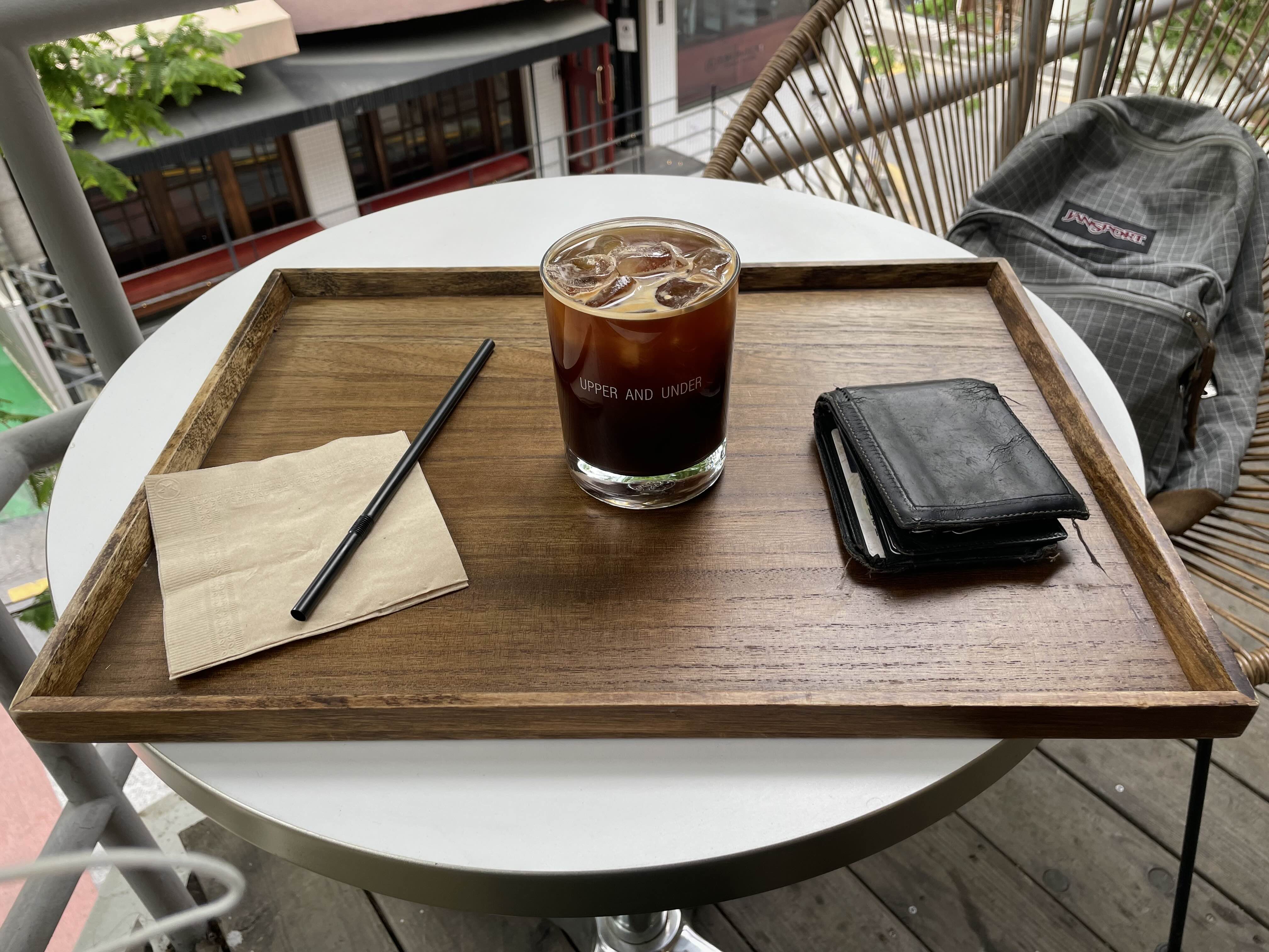 야외 테이블에서 소울 장르의 노래를 들으며 시원한 커피를 먹는데 설렘 반 두려움 반입니다.